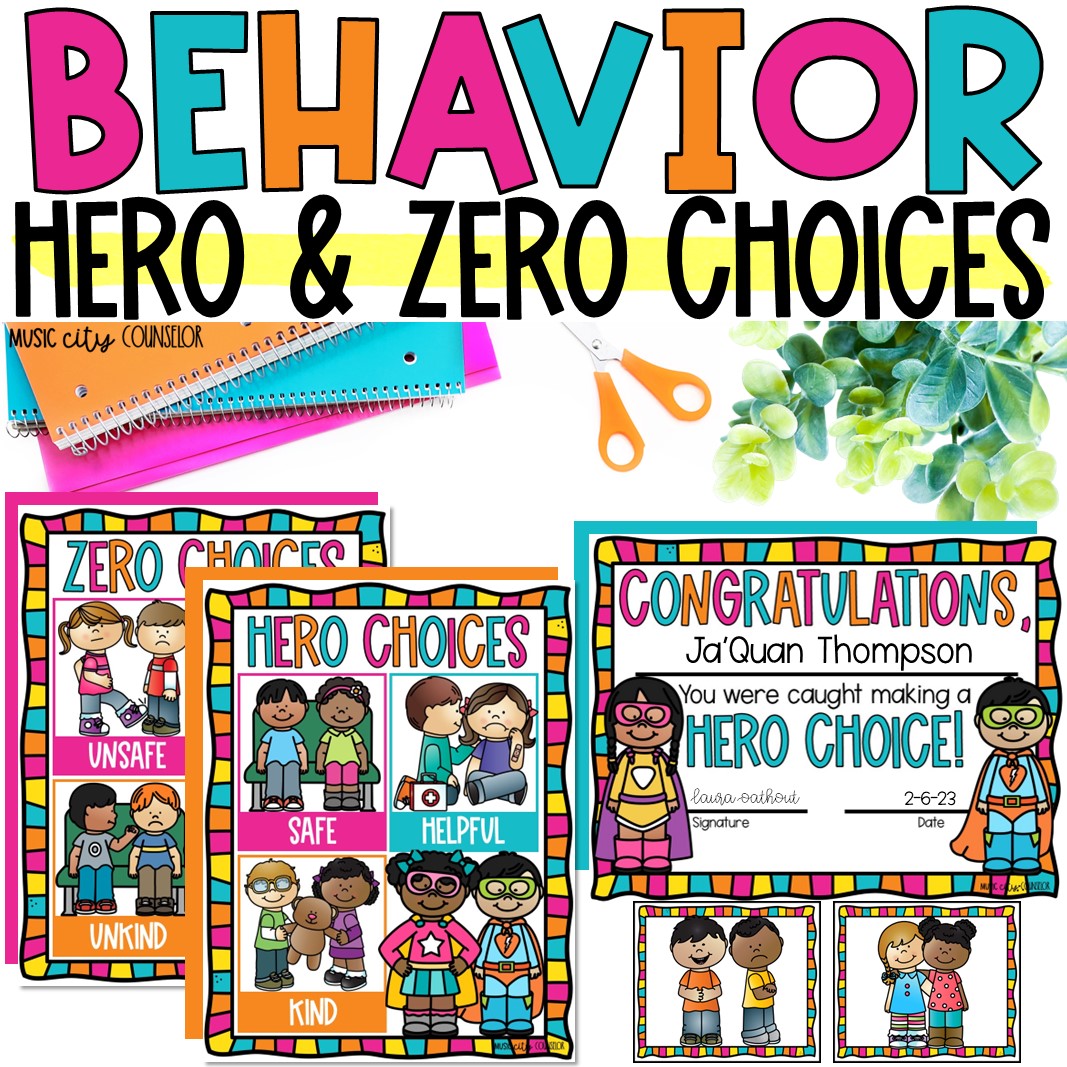 ✅ 2 instructional posters that explain “Hero Choices” (safe, kind, and helpful behaviors) and “Zero Choices” (unsafe, unkind, unhelpful behaviors)